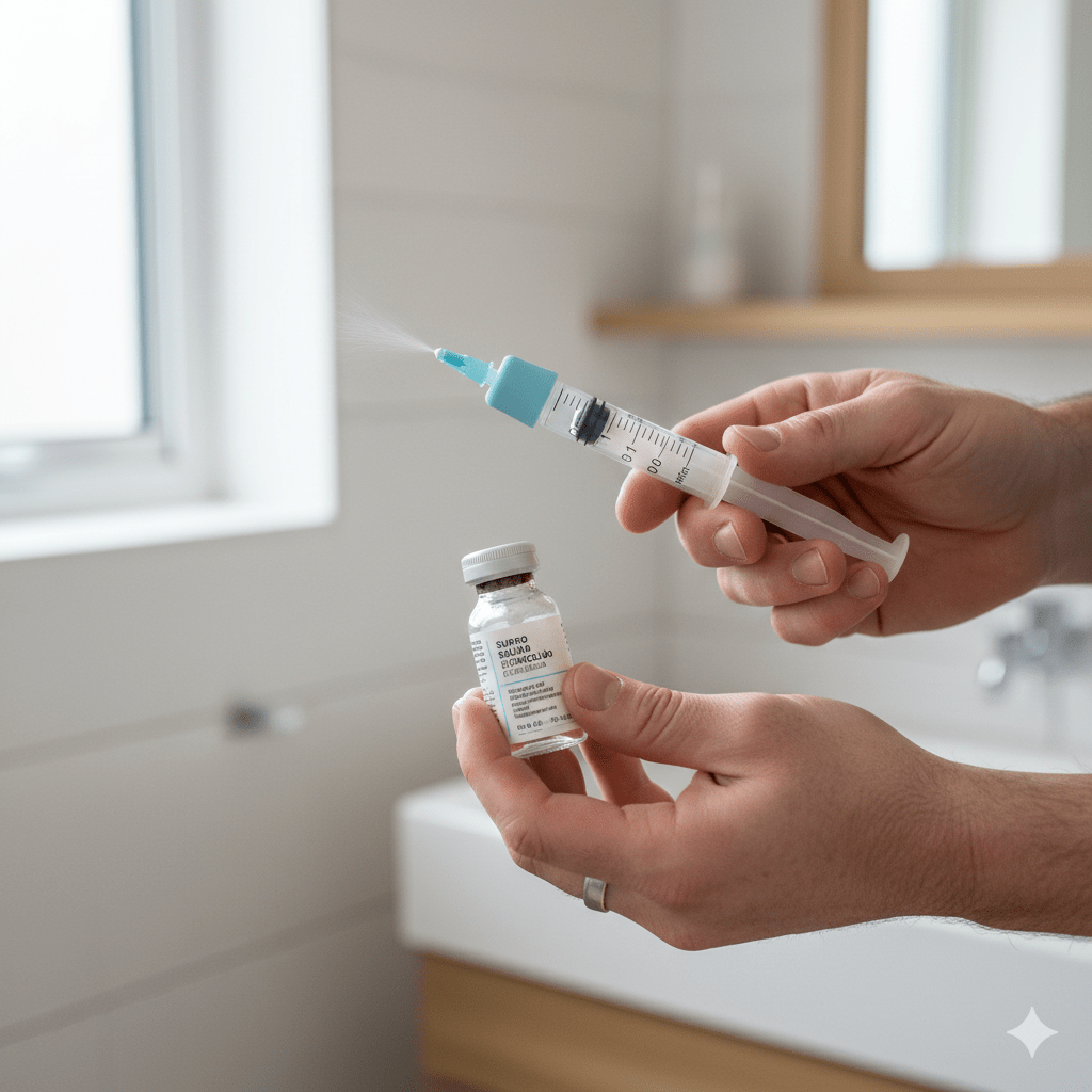 No usamos la jeringuilla a pelo lanzando un chorro a presión de película de acción. Usamos un irrigador de silicona en la punta de la jeringuilla (se compran en cualquier farmacia) que atomiza un poco el suero. Es efectivo, rápido y, sobre todo, llega donde otros métodos no llegan.